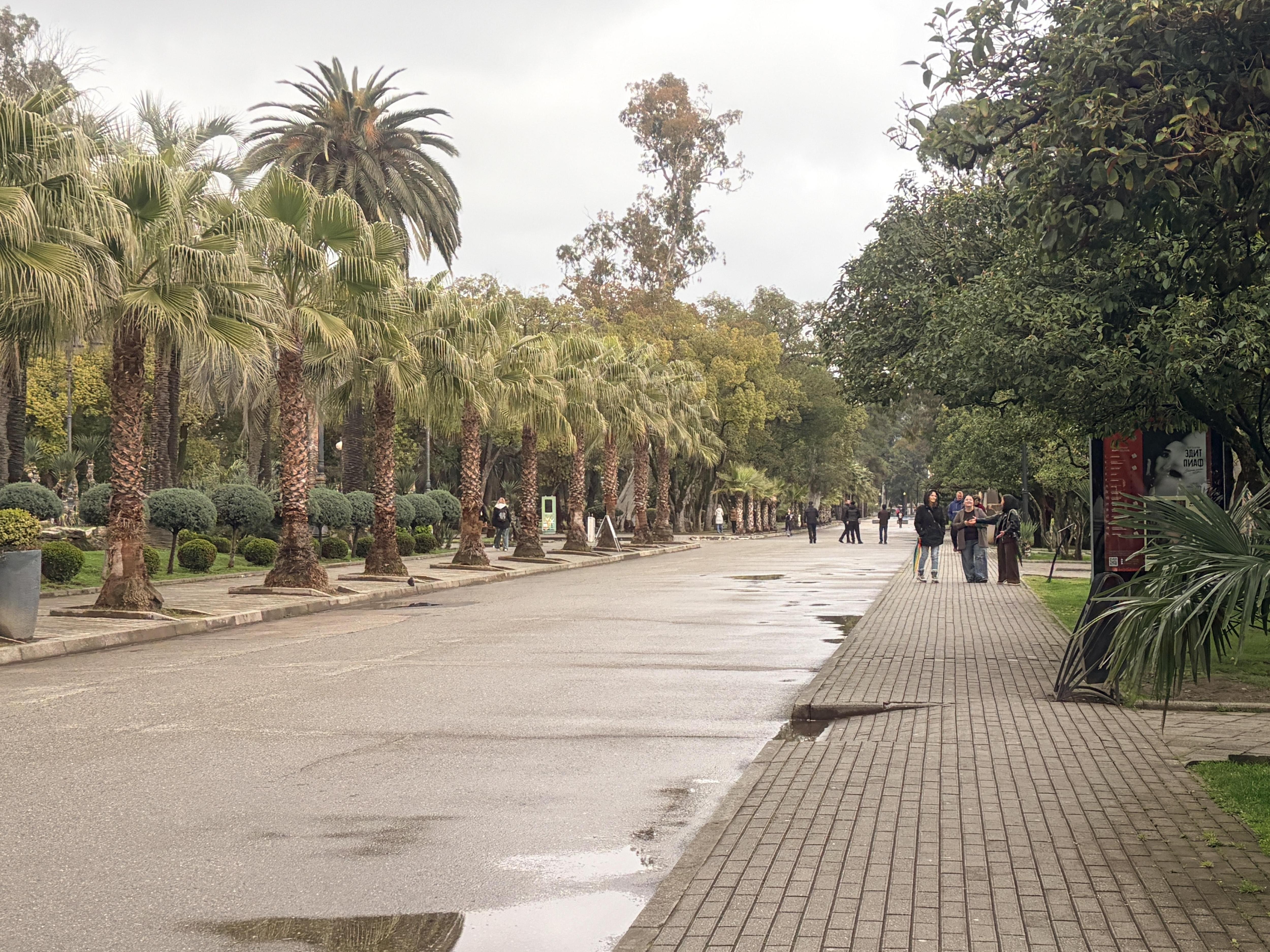 Первая остановка — Гагра. Колоннада на набережной пустовала. Объект недавно отремонтировали. Финиковые пальмы вдоль моря цвели. Осенью они дают урожай. Пальмы выглядят здоровыми, в отличие от некоторых сочинских. Прогулка заняла немного времени.