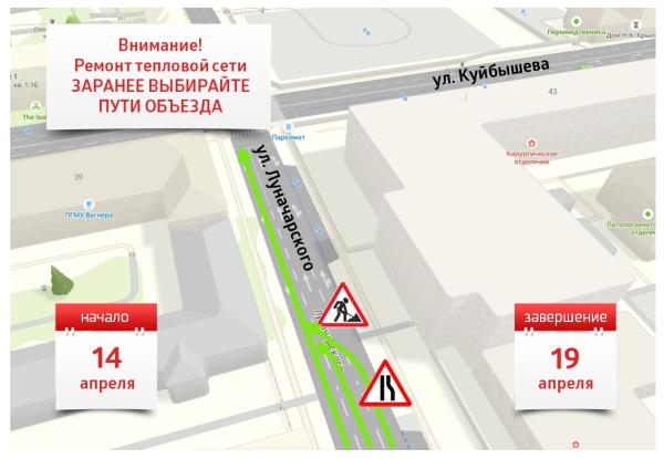 В Ленинском районе Перми энергетики приступили к ремонту тепломагистрали. Из-за работ на улице Луначарского введено ограничение движения транспорта.
